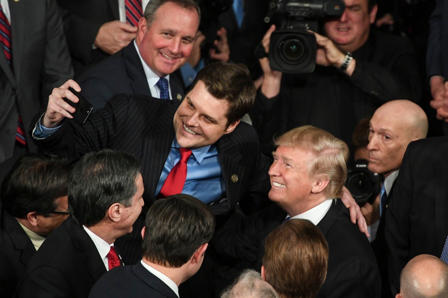 Rep. Matt Gaetz (R-Fla.) takes a selfie with President Trump after the 2017 State of the Union address Jan. 30. (Jabin Botsford/The Washington Post)