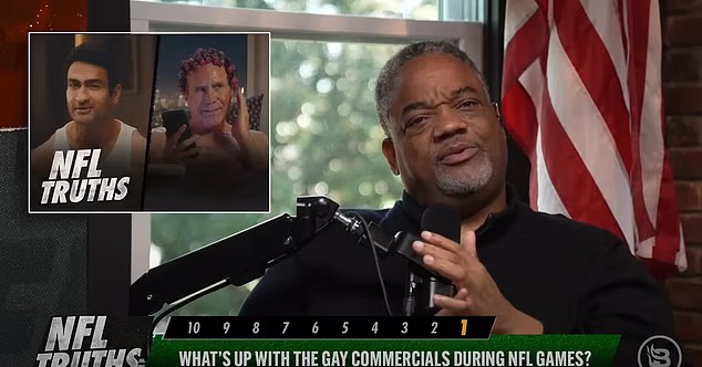 In a video titled ‘NFL Commercials More Gay Than Bad Bunny’, Whitlock said: ‘What’s up with all the gay commercials during NFL games?’