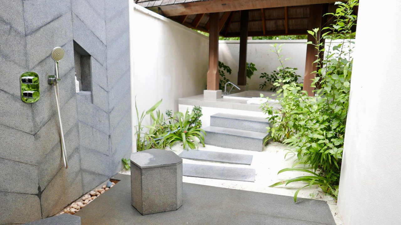 Rooms have contemporary interiors, a glass wall overlooking the beach and a pretty private courtyard with outdoor shower and large bathtub. There is also a walk-in wardrobe, large comfortable bed and remote control blinds.